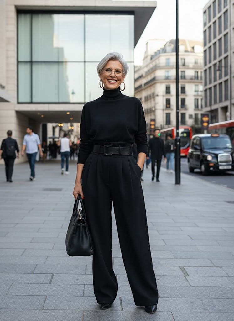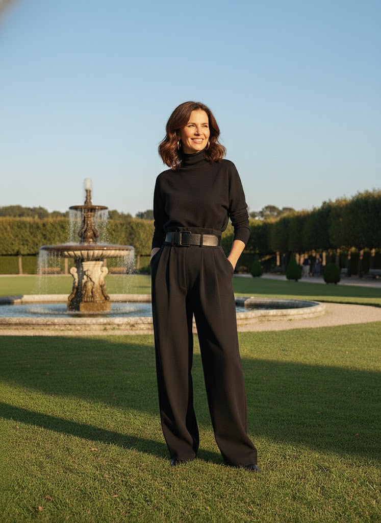 A soft, breathable turtleneck and gently tailored trousers drape beautifully without clinging.